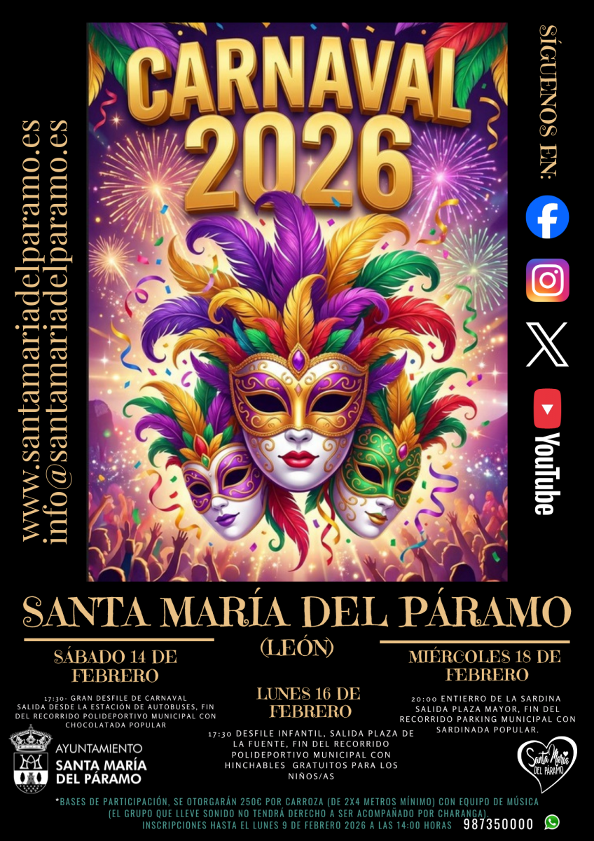 Desfile de Carnaval 2026 17:30 horas Gran Desfile de Carnaval SALIDA: Desde la Estación de Autobuses FIN DEL RECORRIDO: Polideportivo Municipal, con...
