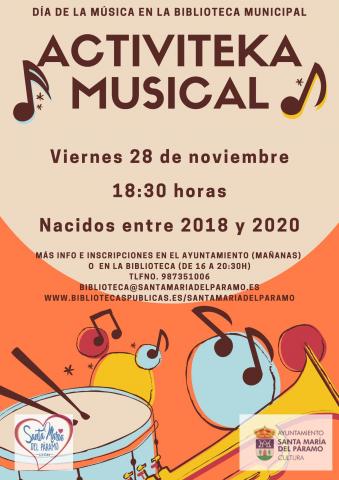 Día de la Música en la Biblioteca Municipal de Santa María del Páramo, el viernes 28 de noviembre de 2025 a las 18:30 horas para nacidos entre 2018 y 2020.