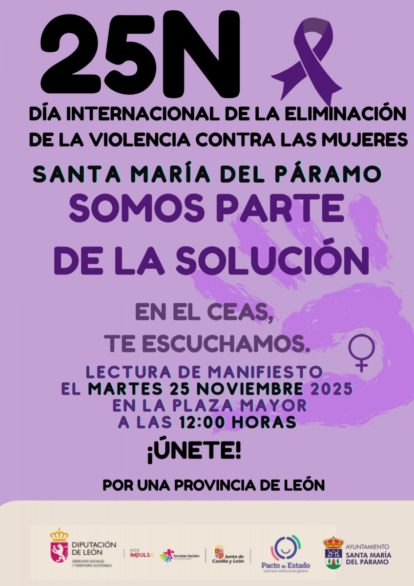 El Ayuntamiento de Santa María del Páramo conmemora el Día Internacional de la Eliminación de la Violencia contra la Mujer, una fecha reconocida mundialmente para denunciar la violencia machista y reclamar políticas y acciones efectivas que garanticen la igualdad y la seguridad de todas las mujeres.