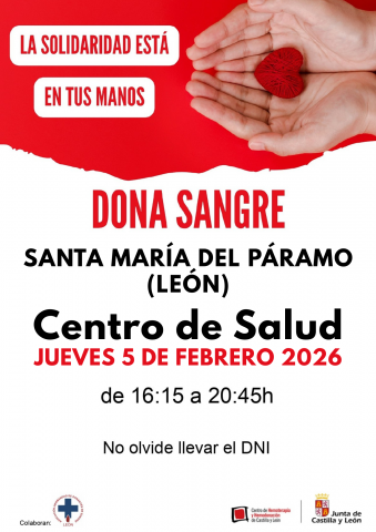 Donaciones Sangre -Santa María del Páramo- el jueves 5 de febrero de 2026, de 16:15 a 20:45 horas, en el Centro de Salud de Santa María del Páramo