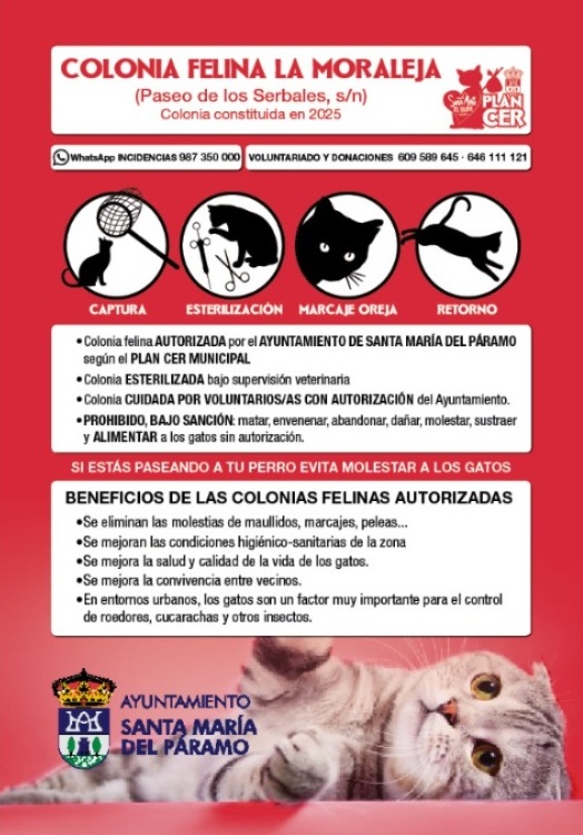 El Ayuntamiento de Santa María del Páramo (León), convoca una reunión informativa para hacer balance, durante el pasado año 2025, del desarrollo del Plan C.E.R. de Gestión Ética de Colonias de Gatos Libres en el municipio, con participación de l@s voluntaria@s que lo llevan a cabo, y para todos aquellos interesados en conocer su implantación y evolución, el próximo viernes 6 de febrero, a partir de las 19:30 horas, en la Sala de Conferencias del Centro Cívico “Magdalena Segurado” de la localidad.