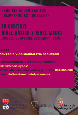 Certificación de competencias digitales Tu CertiCyl -Nivel Básico y Nivel Medio- Lunes 27 de octubre de 2025 a las 12:00 horas en la Sala de Informática del Centro Cívico de Santa María del Páramo...