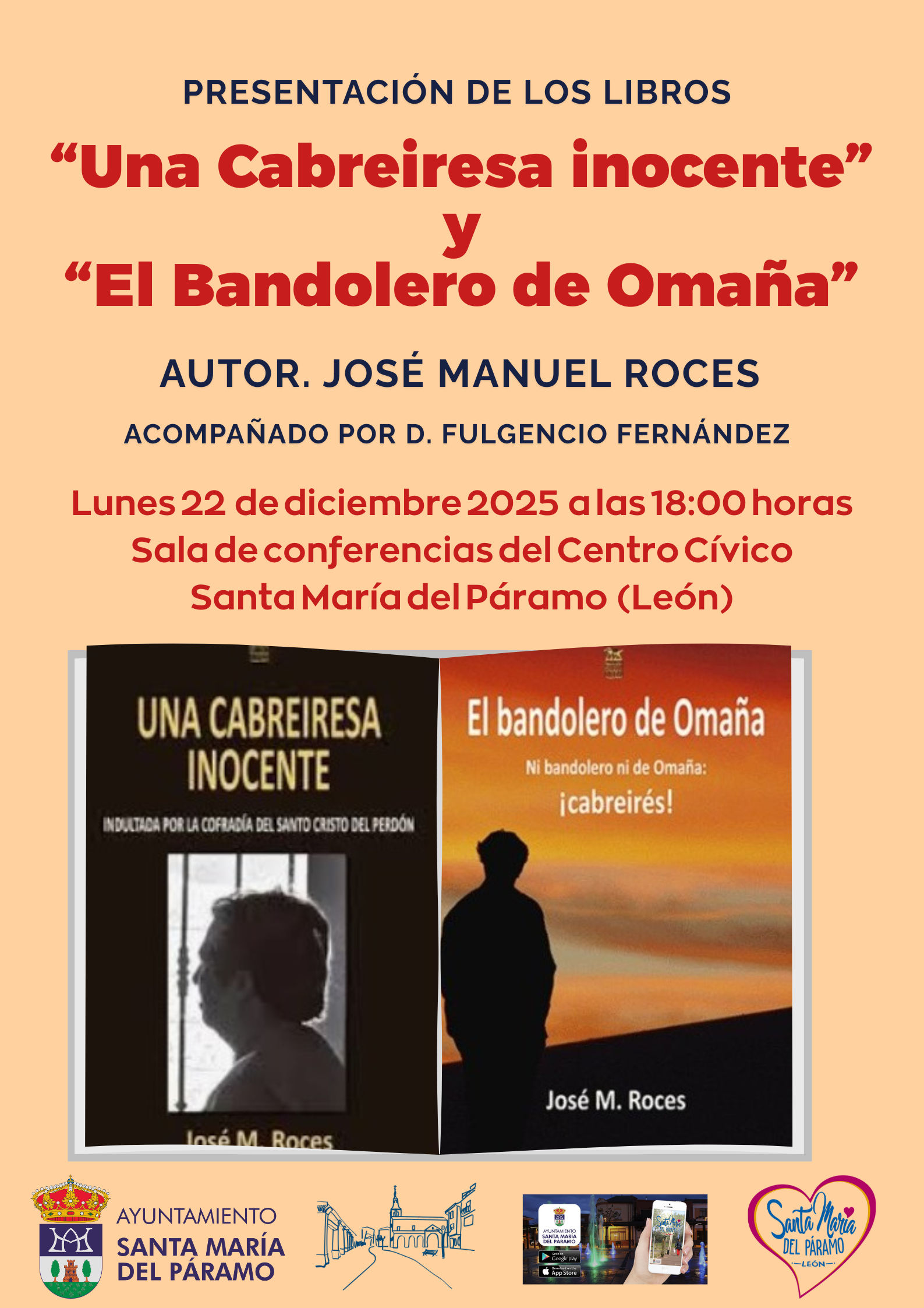 Lunes 22. Presentación de los libros “Una Cabreiresa inocente” y “El Bandolero de Omaña” de Jose Manuel Roces. (Ver Cartel). Lugar: Sala de conferencias C. Cívico Magdalena Segurado. Hora: 18:00hs.