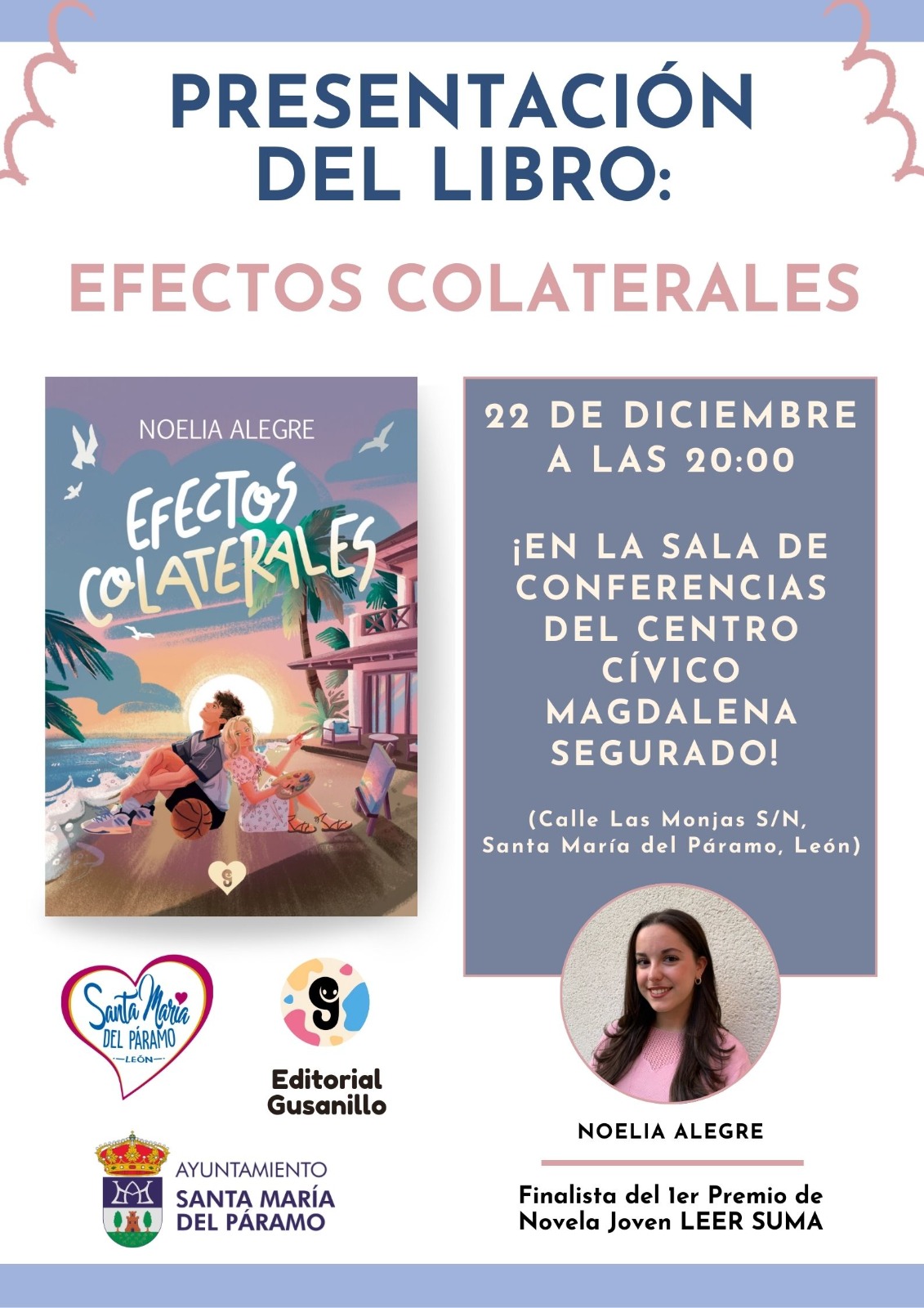Lunes 22. Presentación del libro “Efectos Colaterales” De Noelia Alegre. (Ver Cartel). Lugar: Sala de conferencias C. Cívico Magdalena Segurado. Hora: 20:00hs.