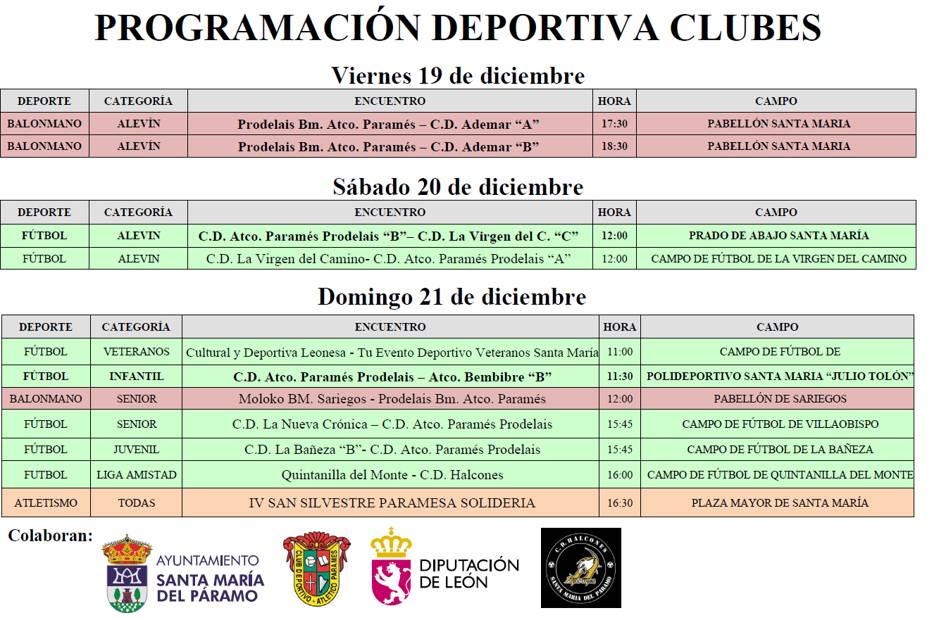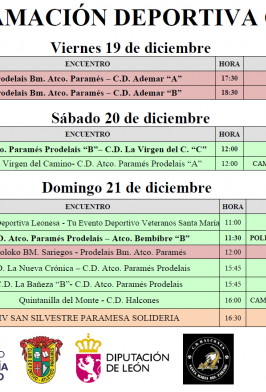 Programación Deportiva Clubes, Santa María del Páramo (León), viernes 19, sábado 20 y domingo 21 de diciembre de 2025.