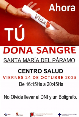 Donaciones de Sangre el viernes 24 de octubre de 2025, de 16:15 a 20:45 horas, en el Centro de Salud de Santa María...