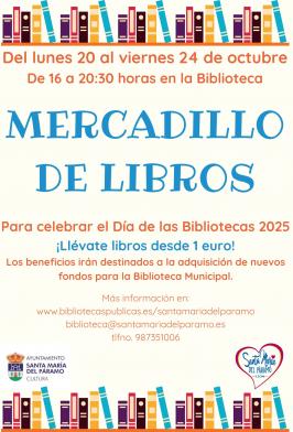 Del lunes 20 al viernes 24 de octubre de 2025, Mercadillo de Libros de 16:00 a 20:30 horas, en la Biblioteca...