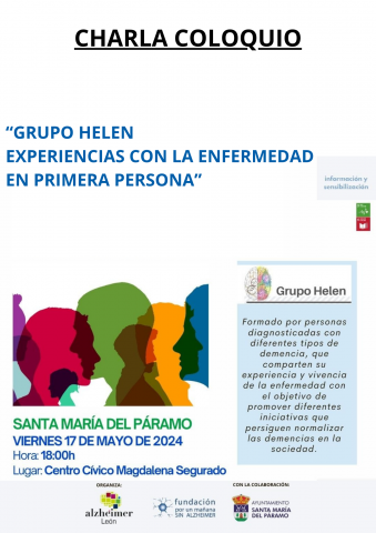 Charla Coloquio "Grupo Helen experiencias con la enfermedad en primera persona", el viernes 17 de mayo de 2024 a las 18:00 horas en el Centro Cívico de Santa María del Páramo.