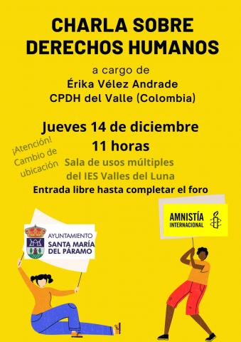Charla sobre Derechos Humanos a cargo de Érika Vélez Andrade CPDH del Valle (Colombia) el jueves 14 de diciembre de 2023 a las 11:00 horas en la Sala de Conferencias del Centro Cívico de Santa María del Páramo.