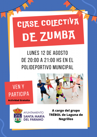 Clase colectiva de Zumba, lunes 12 de agosto de 2024 de 20:00 a 21:00 horas en el Polideportivo Municipal de Santa María del Páramo, a cargo del Grupo Trébol de Laguna de Negrillos.