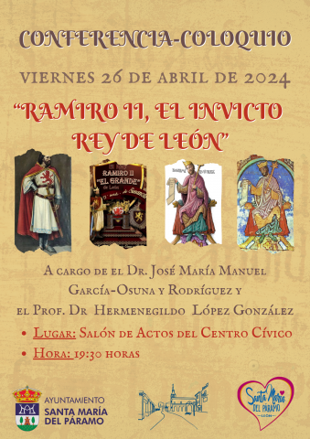Conferencia - Coloquio, "Ramiro II, El Invicto Rey de León" el viernes 26 de abril de 2024 a las 19:30 horas en el Salón de Actos del Centro Cívico de Santa María del Páramo, a cargo de el Dr. Jose María Manuel García - Osuna y Rodríguez y el Prof. Dr. Hermenegildo López González.