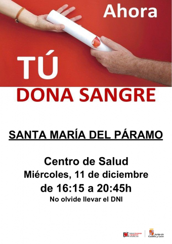 Dona Sangre en el Centro de Salud de Santa María del Páramo el miércoles 11 de diciembre de 2024 de 16:15 a 20:45 horas.