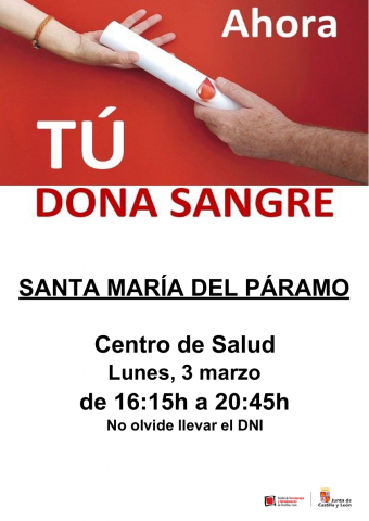 Donaciones de sangre, el lunes 3 de marzo de 2025 de 16:15 a 20:45 horas, en el Centro de Salud de Santa María del Páramo.