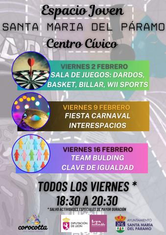 "Espacio Joven" para jóvenes de 12 a 22 años. De 18:30 a 20:30 en el Centro Cívico de Santa María del Páramo.