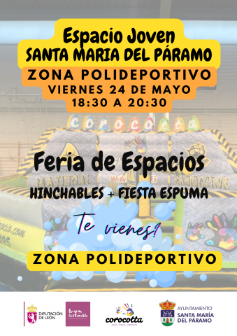 Espacio Joven Santa María del Páramo -Feria de Espacios- el viernes 24 de mayo de 2024 de 18:30 a 20:30 horas en el Polideportivo Municipal de Santa María del Páramo.