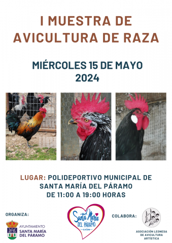 I Muestra de Avicultura de raza, el miércoles 15 de mayo de 2024 de 11:00 a 19:00 horas en el Polideportivo Municipal de Santa María del Páramo.