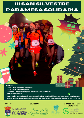 El Ayuntamiento de Santa María del Páramo informa de la apertura de las inscripciones de la III San Silvestre Paramesa Solidaria que tendrá lugar el próximo domingo 22 de diciembre en horario de tarde.