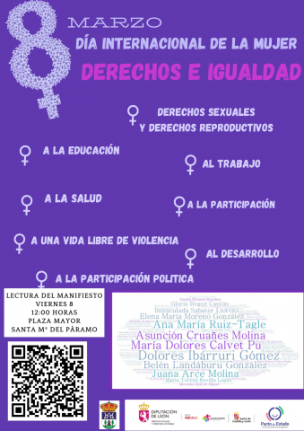 Lectura del Manifiesto "Día Internacional de La Mujer" el viernes 8 de marzo de 2024 a las 12:00 horas en la Plaza Mayor de Santa María del Páramo.