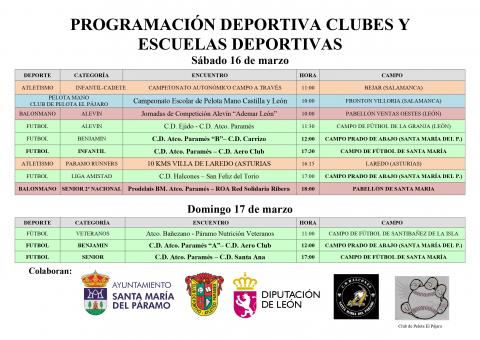 Programación Deportiva,Clubes y Escuelas Deportivas sábado 16 y domingo 17 de marzo de 2024 en Santa María del Páramo.