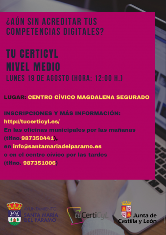 Tu Certicyl Nivel Medio, lunes 19 de agosto de 2024 en la Sala de informática del Centro Cívico de Santa María del Páramo.