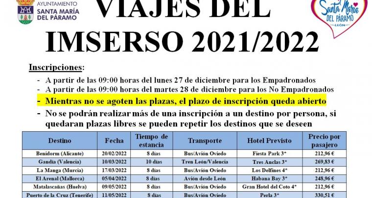El Ayuntamiento de Santa María del Páramo informa que a partir del lunes 27 de diciembre los Empadronados en la localidad podrán solicitar los viajes del IMSERSO 2022 según la...