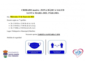 El Ayuntamiento de Santa María del Páramo informa que el próximo miércoles 13 de enero de 2021, en el Pabellón municipal (Polideportivo) se va a realizar un cribado masivo (...