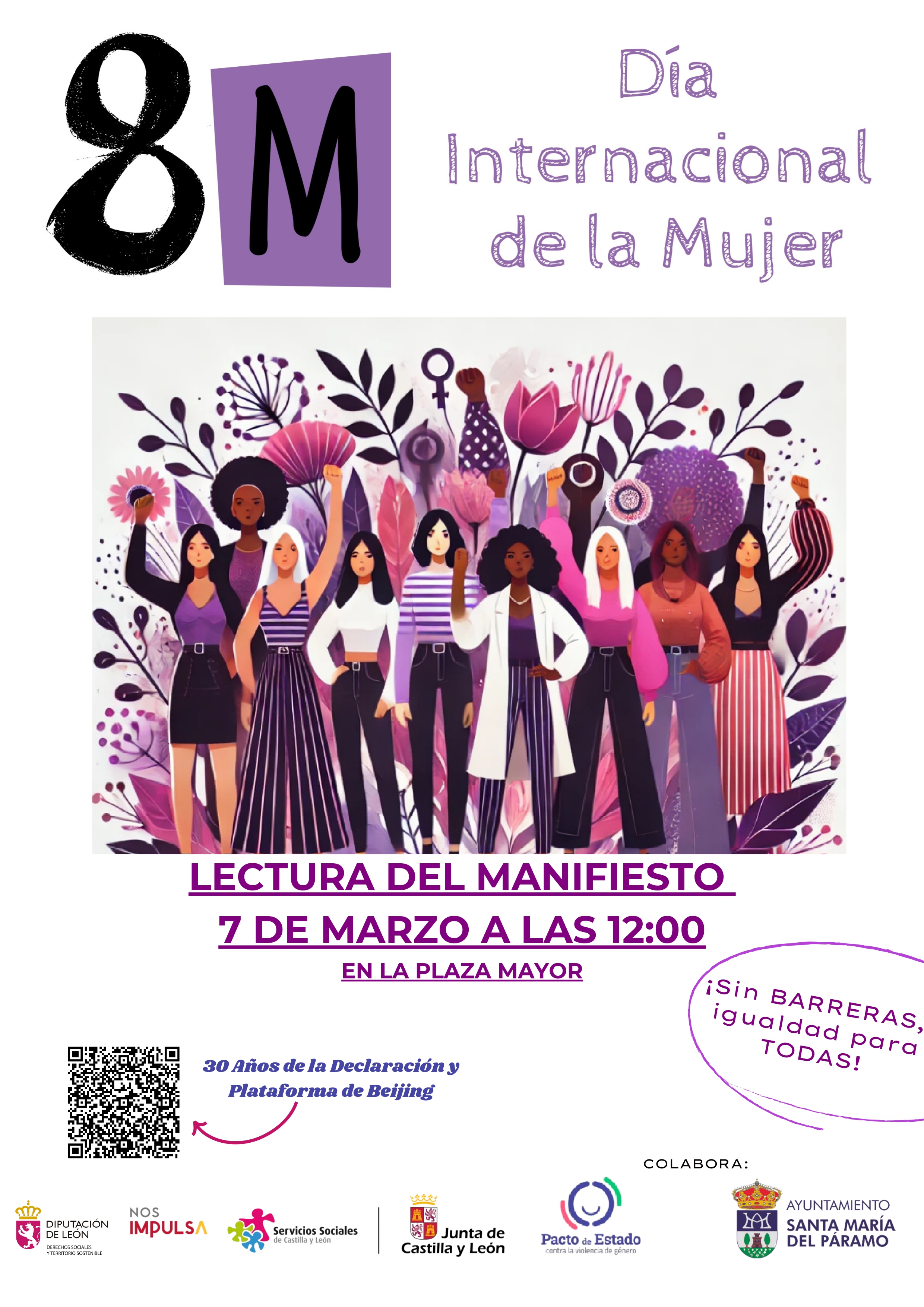 El Ayuntamiento dedicará un fin de semana especial al 8M, con la lectura del manifiesto por el Día de la Mujer que bajo el lema ¡Sin Barreras, igualdad para TODAS! se leerá el viernes 7 en la Plaza Mayor a las 12:00 horas, una chocolatada el sábado 8 a las 19:30 horas en el Club Recreativo Atlético Parames, y una comida que han organizado las Amas de casa para el sábado 8 abierta a todo el que quiera asistir.