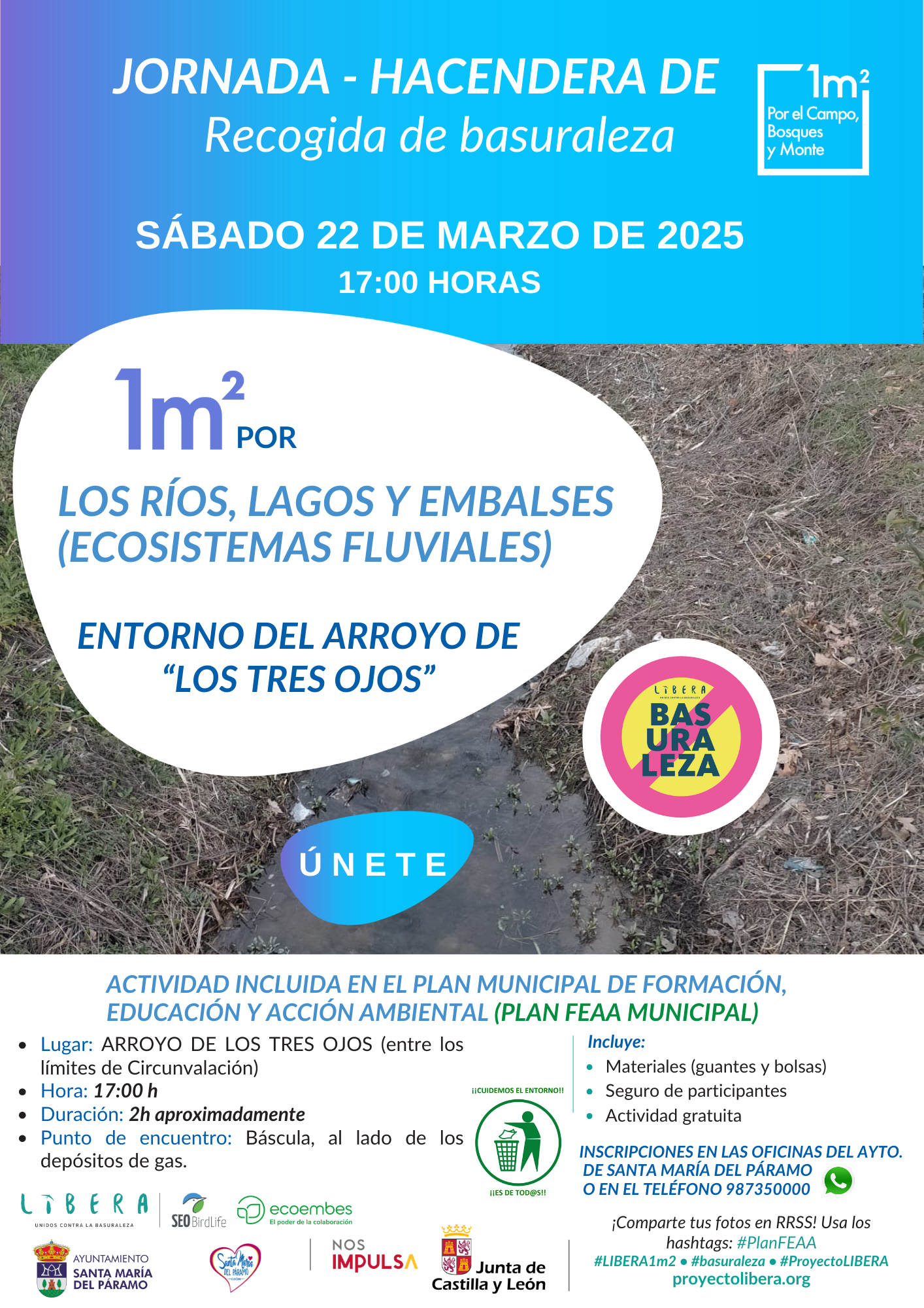 Tal acción se enmarca dentro de la convocatoria “1 m2 contra la basuraleza”, en su campaña activa entre el 8 y el 23 de marzo, “1m2 por los ríos, lagos y embalses (ecosistemas fluviales)”, del proyecto LIBERA, auspiciados por las organizaciones SEO BirdLife y Ecoembes, con el fin de recolectar la basuraleza que amenaza los ecosistemas acuáticos, y que es arrojada y arrastrada en los cauces fluviales de estos entornos… De esta forma, las recogidas colaborativas que LIBERA convoca varias veces anualmente, son para liberar a la naturaleza de la basura que otros tiraron y no retiraron, y a las que el Ayto. paramés se ha adherido en sus diferentes convocatorias desde hace un año, para la limpieza de diferentes entornos del municipio.