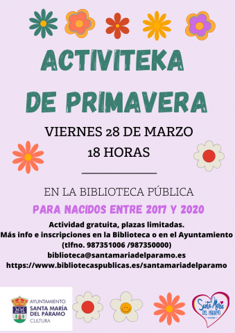 Activiteca de Primavera, viernes 28 de marzo de 2025 a las 18:00 horas en la biblioteca pública municipal de Santa María del Páramo.