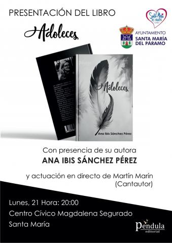Presentación del libro -Adolces- el lunes 21 de abril de 2025 a las 20:00 horas en el Centro Cívico de Santa María del Páramo, con la prepresencia de su autora Ana Ibis Sánchez Pérez y actuación en directo de Martín Marín (cantautor)