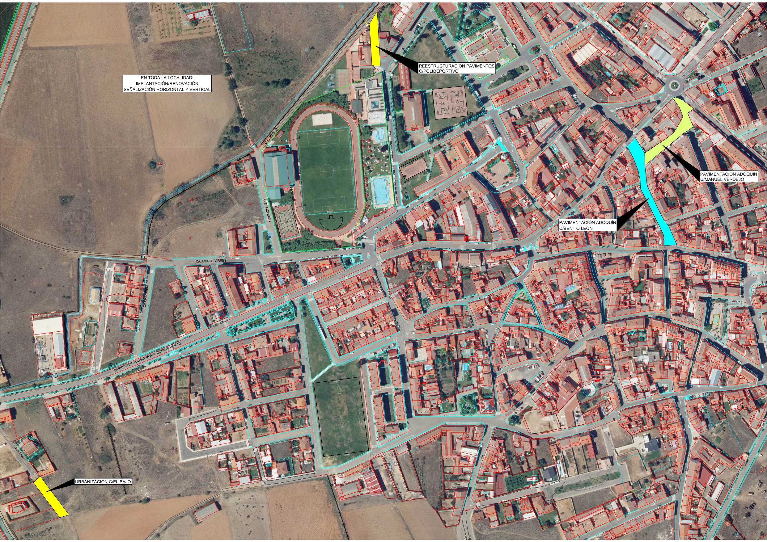 También se hace necesaria la reestructuración de pavimentos externos en la calle del polideportivo con una reordenación de espacios de peatones, circulación, aparcamiento, nuevos movimientos y elementos de drenaje, así como la calle Benito León, para la que se proyecta la renovación de sus pavimento, aceras y calzada de adoquín prefabricado en dos colores, tipo románico, igual que en la calle Verdejo, de manera que vienen a cerrar esta zona más tradicional del municipio.