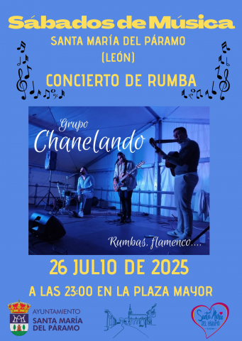 Sábados de Música en Santa María del Páramo (León) Data: 26/07/2025Lugar: Plaza Mayor Sábados de Música en Santa María del Páramo (León). Concierto de Rumba "Chanelando", sábado 26 de julio de 2025 en la Plaza Mayor a las 23:00 horas.