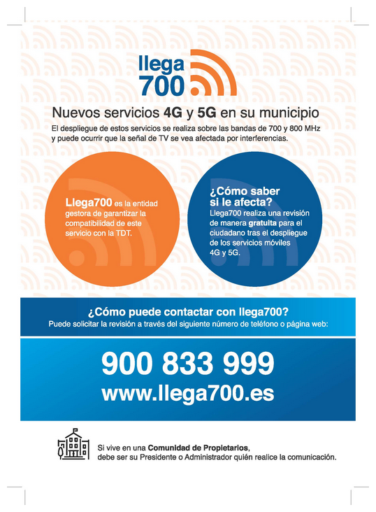 El Ayuntamiento de Santa María del Páramo informa que, si se observan interferencias en la televisión, se recomienda llamar al teléfono gratuito de Llega700 (900 833 999)