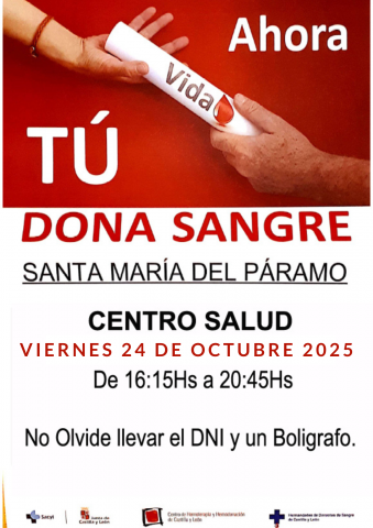 Donaciones de Sangre el viernes 24 de octubre de 2025, de 16:15 a 20:45 horas, en el Centro de Salud de Santa María del Páramo (León)