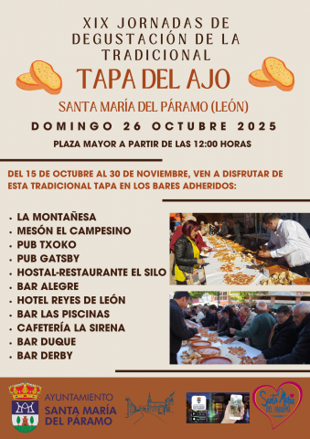 Ven a disfrutar de la XIX Jornadas de degustación de la tradicional Tapa del Ajo, el domingo 26 de octubre de 2025 a partir de las 12:00 horas en la Plaza Mayor de Santa María del Páramo (León).
