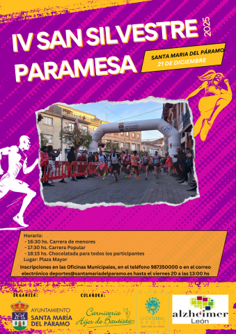 El Ayuntamiento de Santa María del Páramo informa de la realización de la "IV San Silvestre Paramesa Solidaria" el próximo domingo 21 de diciembre cuya recaudación irá a favor de la Asociación Parkinson León. A continuación, se muestra el reglamento o información de la prueba: