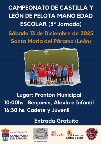 Campeonato de Castilla y León de Pelota Mano en Edad Escolar Data: 13/12/2025 Campeonato de Castilla y León de Pelota Mano en Edad Escolar Sábado 13 de Diciembre de 2025 Santa María del Páramo (León) Lugar: Frontón Municipal 10:00hs. Benjamin, Alevín e Infantil 16:30 hs. Cadete y Juvenil horario_jornada_edad_escolar_mano_2v-1.pdf