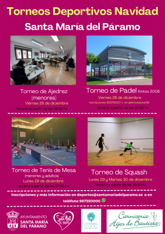 Lunes 29 y martes 30. Torneo de Squash. (ver cartel). Lugar: Pistas de Squash del Polideportivo Municipal. Hora: 18:30hs.