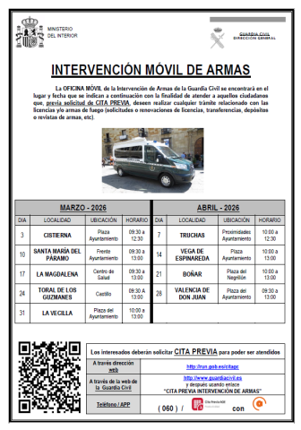 La OFICINA MÓVIL de la Intervención de Armas de la Guardia Civil se encontrará en el lugar y fecha que se indican a continuación con la finalidad de atender a aquellos ciudadanos que, previa solicitud de CITA PREVIA, deseen realizar cualquier trámite relacionado con las licencias y/o armas de fuego (solicitudes o renovaciones de licencias, transferencias, depósitos o revistas de armas, etc).