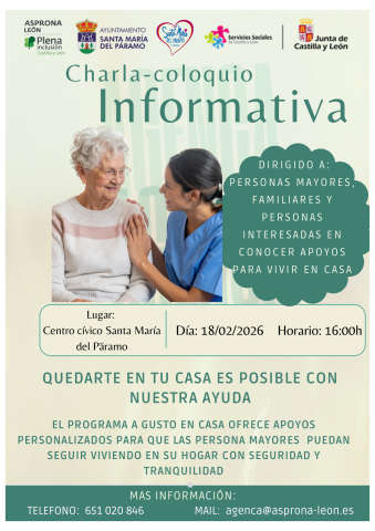 Charla - Coloquio Informativa, el miércoles 18 de febrero de 2026 a las 16:00 horas en el Centro Cívico de Santa María del Páramo.
