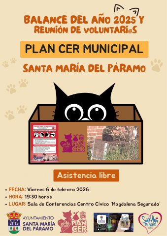 Balance del año 2025 y reunión de voluntari@s PLAN CER MUNICIPAL Santa María del Páramo, el viernes 6 de febrero de 2026 a las 19:30 horas, en la Sala de Conferencias del Centro Cívico "Magdalena Segurado".