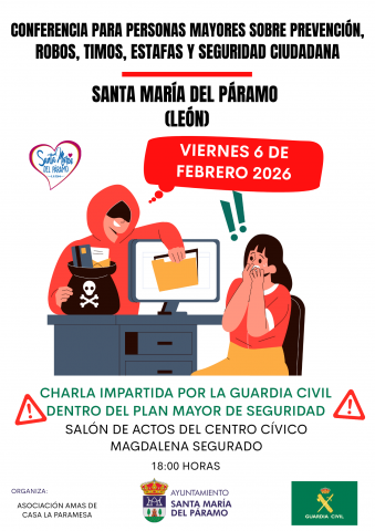 Conferencia sobre prevención, robos, timos, estafas y seguridad cuidadana, el viernes 6 de febrero de 2026 a las 18:00 horas en el Salón de Actos del Centro Cívico de Santa María del Páramo.