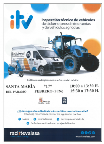 De ciclomotores de dos ruedas y de vehículos agrícolas, el martes 17 de febrero de 2026, de 10:00 a 13:00 horas y de 15:30 a 17:30 horas, en la Calle Embalse de Luna de Santa maría del Páramo.