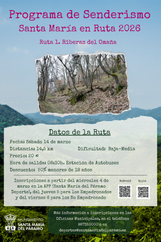La primera de las rutas se realizará el próximo sábado 14 de marzo y se titula "Ribera del Omaña”, la inscripción de esta primera ruta comienza el miércoles 4. Las características de la ruta son: