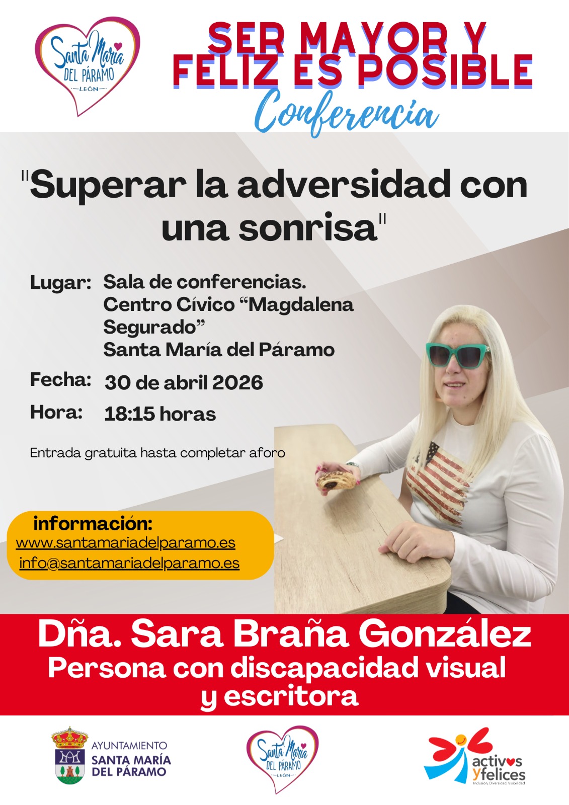 CHARLA SER MAYOR Y FELIZ ES POSIBLE DÍA 30 DE ABRIL Data: 30/04/2026Lugar: Centro Cívico Charla ser mayor y feliz dia 30 de Abril